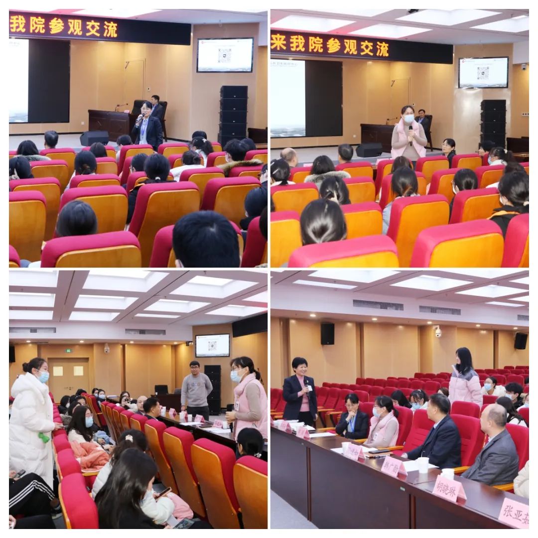 座谈会上,孙道如、吕开雪对韩广勋一行的到来表示热烈欢迎。他们表示,医院十分重视人才队伍建设和特色学科建设,与济宁医学院有着广泛和深厚的交流,希望借此契机,增进友谊、加深合作,合力为济宁市公共卫生医疗中心发展注入更多新鲜血液,进一步推动双方可持续高质量发展。韩广勋对毕业学生的情况进行了简单的介绍,希望通过此次参观交流,能进一步加深院校合作,为同学们提供更多的实践机遇与高质量就业岗位。医教部主任华燕美、护理部主任李红军分别对医院临床科室、护理学科建设等情况进行了详细介绍。人力资源部主任田丽对医院基本情况、招聘形式及人员需求进行了简单介绍,并建立微信群,热烈欢迎医学院更多的同学们能加入医院。