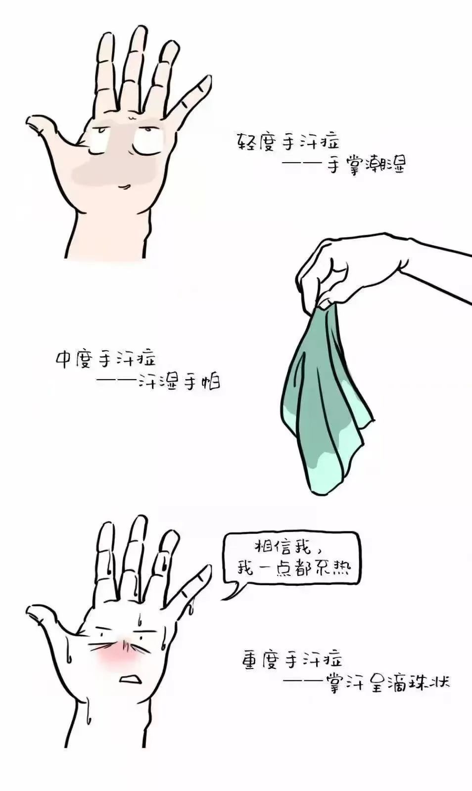 手汗症是局限性多汗症的一种,对个人社会生活的影响较大,常表现为容易影响手操作的灵活性;干扰手工操作;不愿与别人握手而影响人际交往,并产生躲避、焦虑的心态。调查表明:50%患者自信心不足,38%患者有挫折感,20%患者有压抑感。