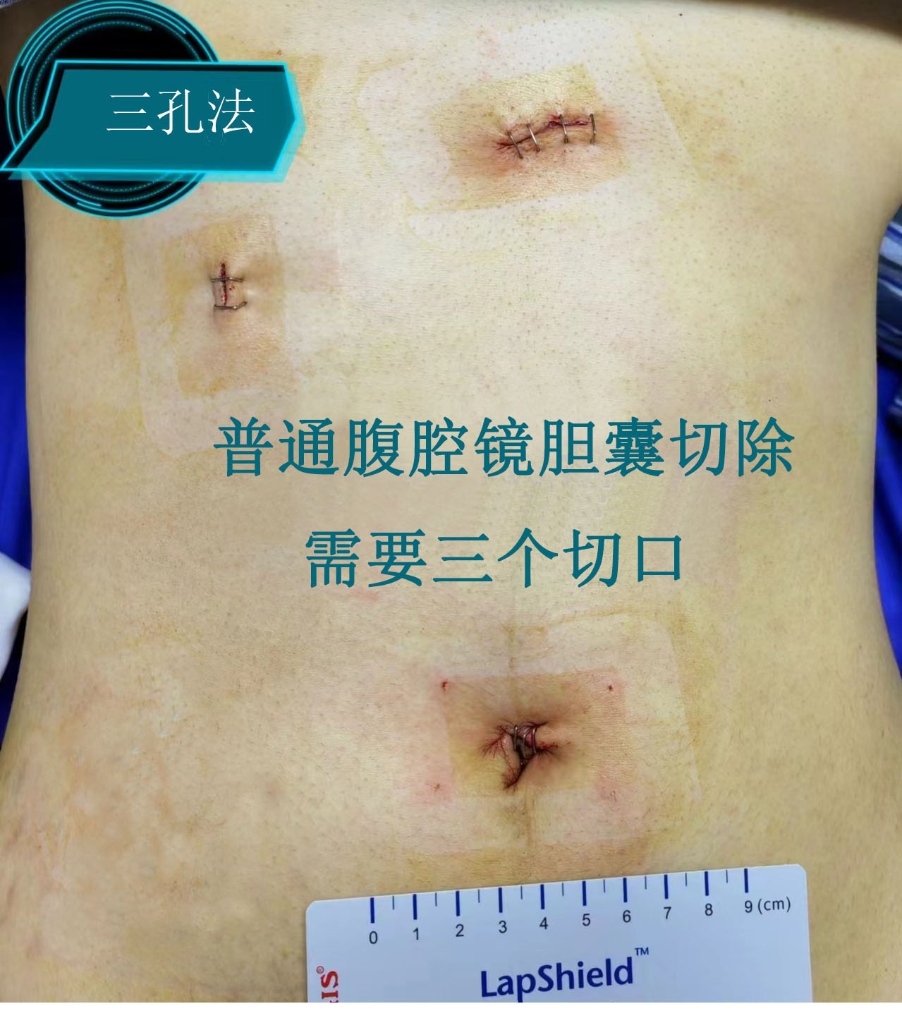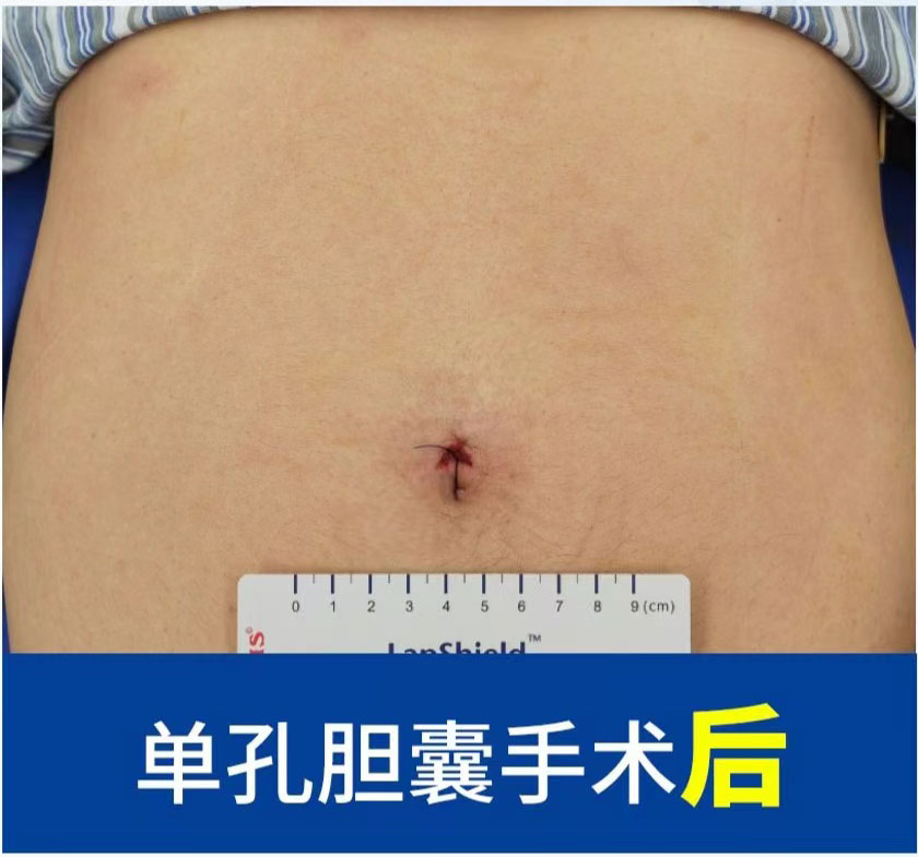 患者咨询多家医院均建议行腹腔镜胆囊切除手术(三孔法),患者了解到我院肝胆外科副主任医师马建博士可以施行1cm单孔腹腔镜手术后,慕名前来手术治疗。马建主任带领肝胆外科团队对患者的病情进行充分的评估后,认为该患者可以进行单孔腹腔镜下胆囊切除术。在与患者及家属充分沟通后,肝胆外科团队成功为患者实施了经脐单孔腹腔镜胆囊切除术。术中经肚脐自然褶皱处切口1cm,术中顺利切除胆囊,用时40分钟,几乎无出血,术后只有单个手术切口隐蔽于肚脐处,既解除了胆囊疾病的病痛,又提供了最佳的美观效果。次日患者进食无不适,现已办理出院。
