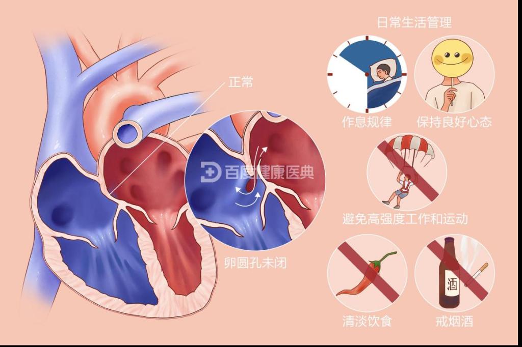大多数患者由于心脏内血液分流量小,卵圆孔未闭不会出现明显症状。然而,一旦因各种原因导致右心房压力超过左心房,如剧烈运动、咳嗽或潜水等,可发生明显的右向左异常分流,导致反常栓塞等相关临床综合征,出现脑卒中、脑缺血发作、头痛、头晕、呼吸困难或肢体无力等症状,是最常见的成人先天性心脏异常之一。一般需注意休息,避免过度劳累,避免快速放松呼气、尖叫、咳嗽、用力排便等可导致胸腔压力增加的动作。