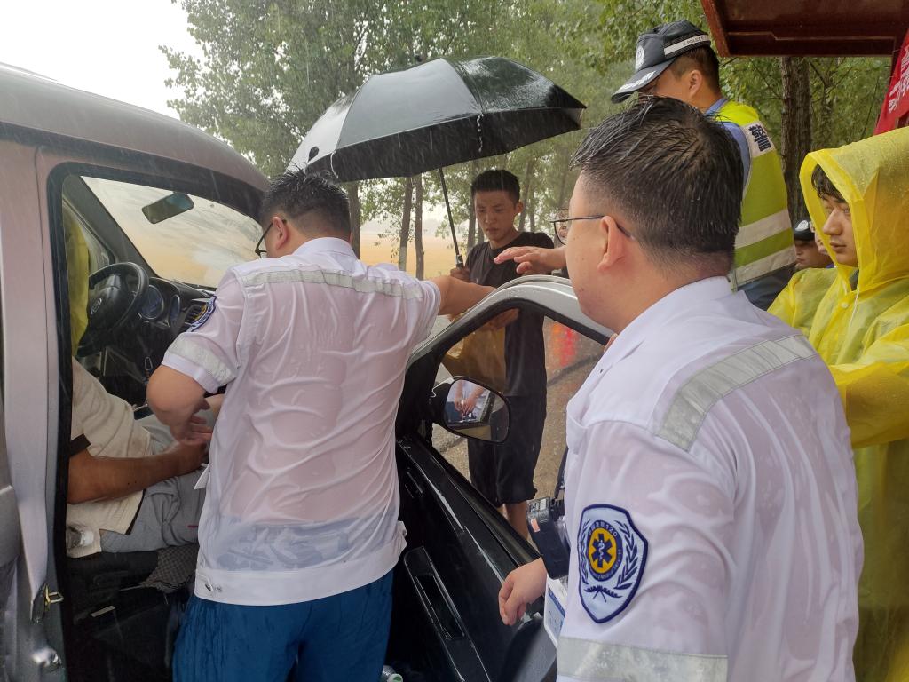 抵达现场时,急救团队顾不上穿戴雨具,蹚着积水冲向事故车辆。患者头颈部出血不止,金康医师立即俯身实施压迫止血,曾庆彪护士同步准备急救器械,急救车司机高先宣则快速协调担架转运。暴雨中,他们的急救制服很快被淋透,雨水混着汗水顺着脸颊滑落,双手却始终稳而精准地操作着:快速消毒、压迫止血、固定……每一个动作都在与“死神”抢时间。