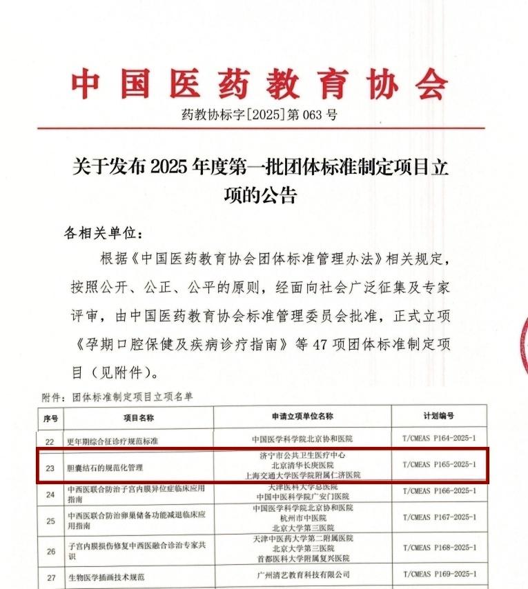 近日,中国医药教育协会发布公告,济宁市公共卫生医疗中心肝胆外科马建博士牵头,联合北京清华长庚医院、上海交通大学医学院附属仁济医院等单位,获批制定《胆囊结石的规范化管理》指南标准。这是市公共卫生医疗中心首次获得牵头制定国家级学会平台团队标准,标志着医院肝胆外科迈上新的发展阶段。
