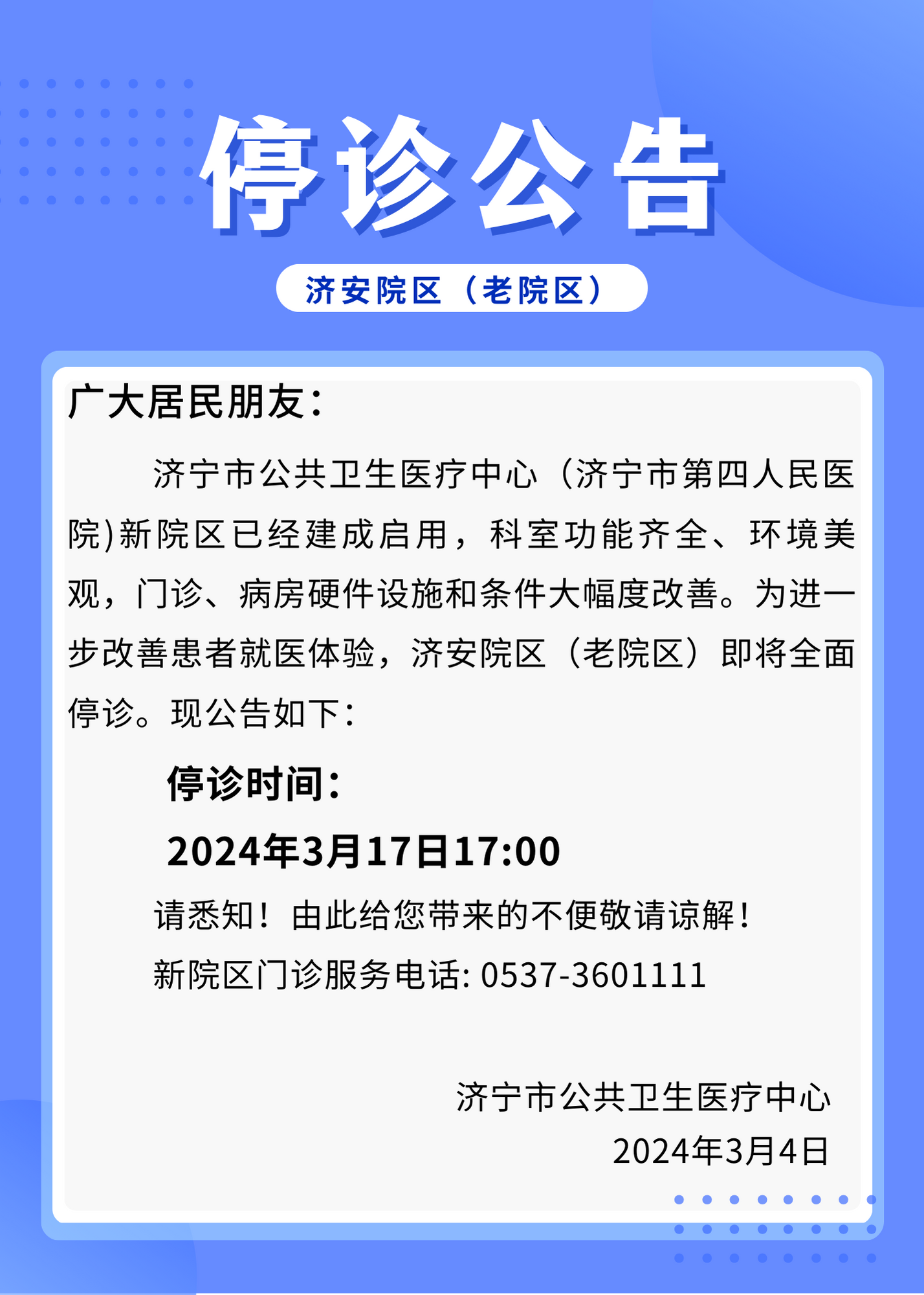 医院免费公交线路:汽车南站——汽车北站——曹东村(古槐北路)——济宁市第四人民医院——岱庄矿路口(古槐路)——后寺村(长兴路)——济宁市公共卫生医疗中心(终点站)