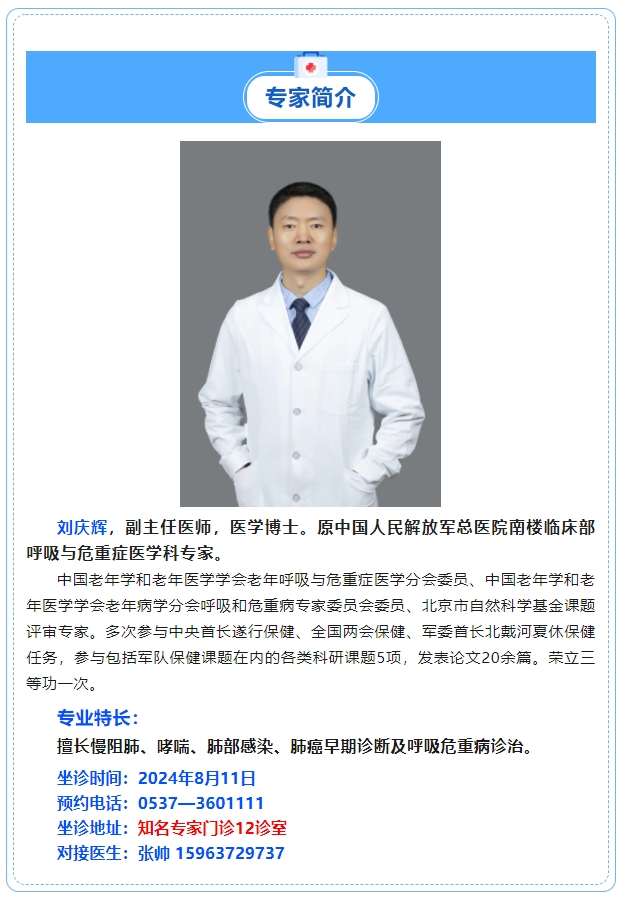 原中国人民解放军总医院南楼临床部呼吸与危重症医学科专家刘庆辉教授来院坐诊!