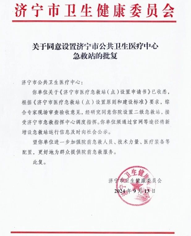 近期,济宁市公共卫生医疗中心二级急救站顺利通过各项考核并获批,已于2024年10月1日,正式联网运行。