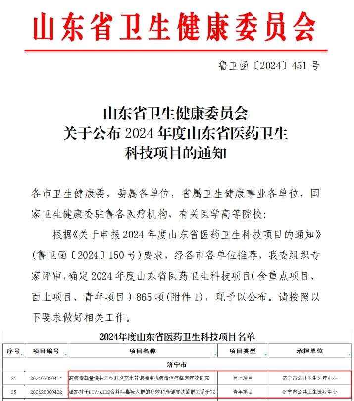 近日,山东省卫生健康委员会公布了2024年度山东省医药卫生科技项目,济宁市公共卫生医疗中心两项课题获批立项。其中,感染性疾病科王雪云主任牵头《高病毒载量慢性乙型肝炎艾米替诺福韦抗病毒治疗临床疗效研究》获批“面上项目”,邓文静博士牵头《温热对于HIV/AIDS合并病毒疣人群的疗效和局部皮肤菌群关系研究》获批“青年项目”。