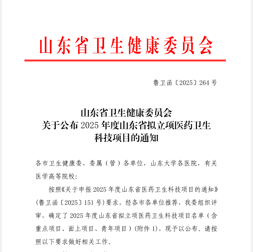下步,我院将严格按照山东省医药卫生科技项目管理要求,加强对获批课题的全过程监督与组织保障,确保项目高标准、高质量完成。同时,以此次立项为契机,进一步激发全院科研创新活力,持续深化基础研究与临床应用的协同创新,力争产出更多高质量的科研成果,为保障人民群众健康、推动区域医疗质量持续提升作出更大贡献。