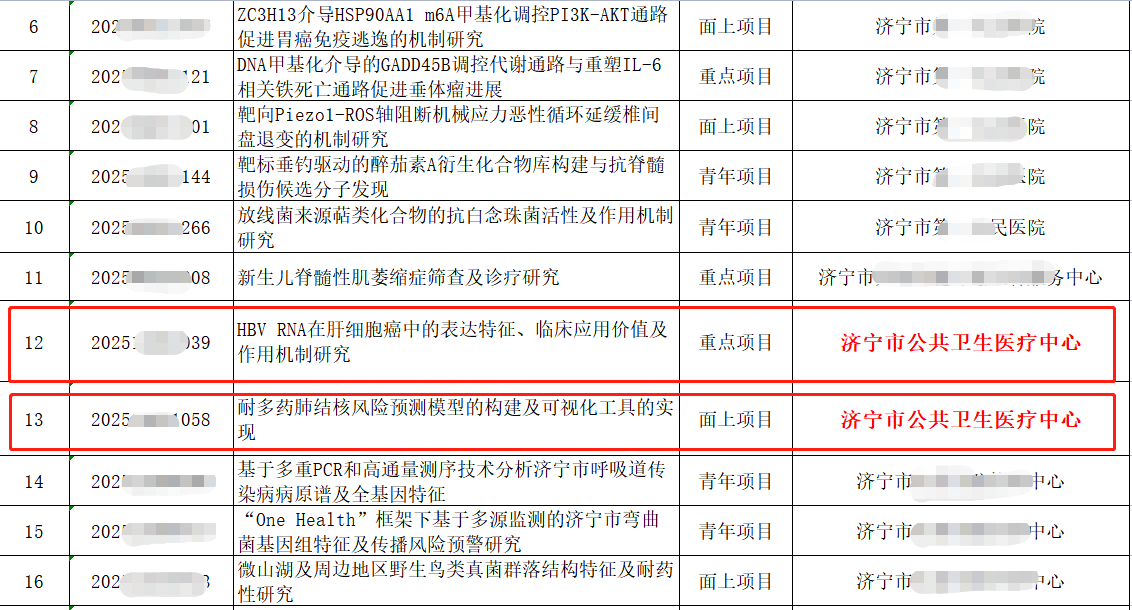 近日,山东省卫生健康委员会正式公布2025年度山东省医药卫生科技项目立项名单,我院两项课题获批立项。其中,医学检验科杨玉林主任牵头的课题《HBV RNA在肝细胞癌中的表达特征、临床应用价值及作用机制研究》获批“重点项目”,护理部崔文娟主任牵头的课题《耐多药肺结核风险预测模型的构建及可视化工具的实现》获批“面上项目”。