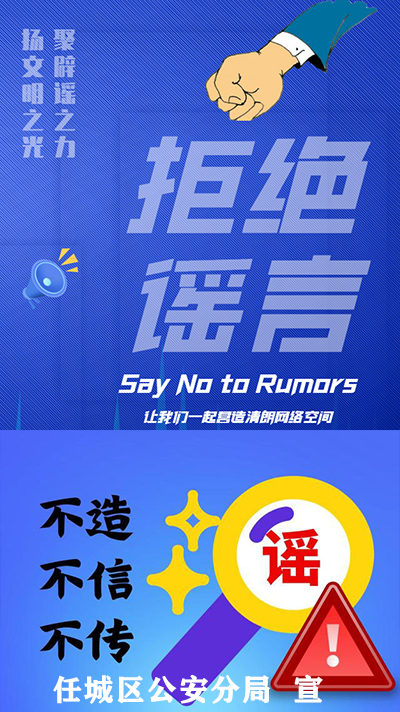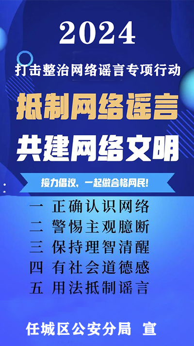 任城网警邀请您一起抵制谣言,共创网络文明:请广大群众仔细甄别,不要轻信网络谣言,不在互联网发布未经核实的信息,不编造虚假信息在网络或者媒体上传播。注意保护个人信息,自觉抵制网络谣言、虚假信息、低俗信息,遇到网络谣言等不良信息,积极向公安机关提供线索,共同建设平安任城。