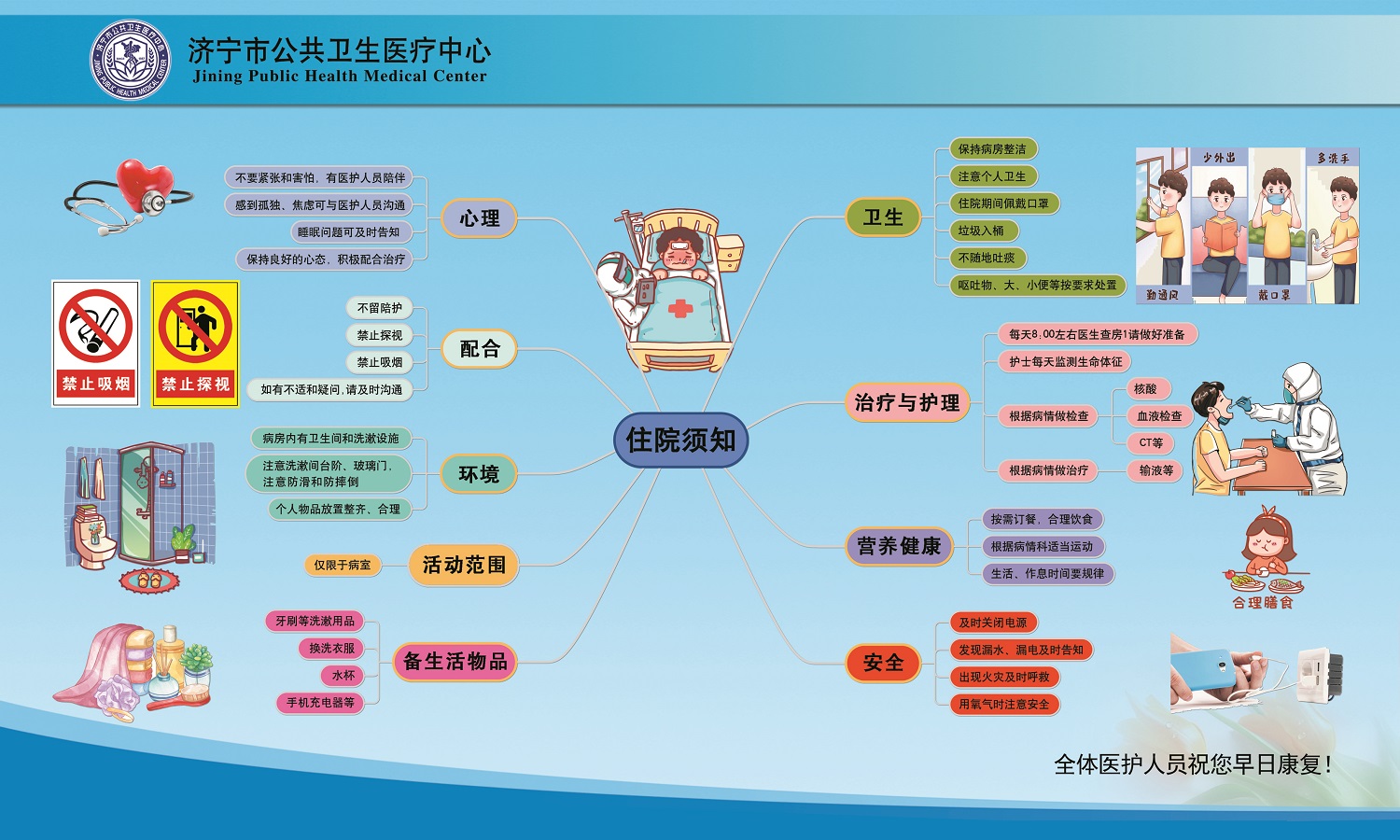 3.带患者或家属熟悉病室环境及病区管理制度,按入院告知程序做好入院宣教,如病室内不准吸烟、饮酒,住院期间不准外出等;详细介绍入院须知,包括病室环境、作息时间、饮食制度、医生查房时间、呼叫器的使用、物品保管、防火防盗、主管医师及责任护士等。
