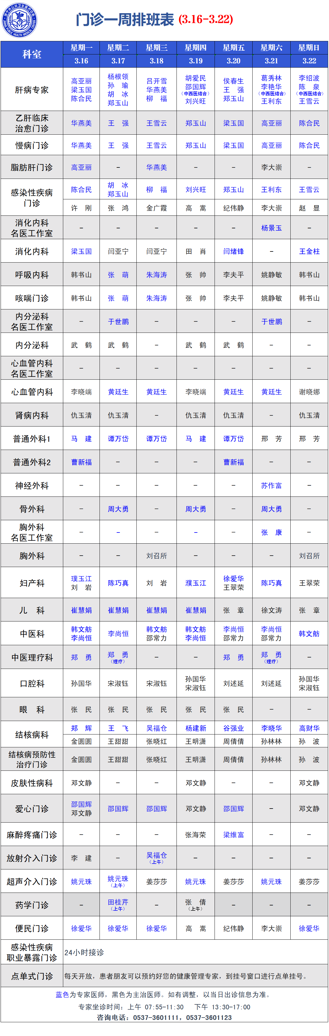 门诊一周坐诊表